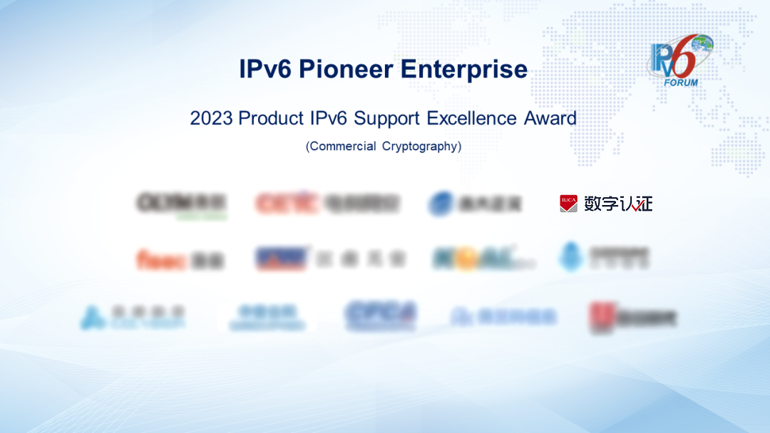 本次中国区2023年度IPv6先锋企业的评选以2023年度《全球IPv6支持度白皮书》所收集的数据为主要参考,并结合全球IPv6论坛IPv6 Ready Logo委员会专家的专业评审,最终评选得出。其中本年度“IPv6先锋企业-IPv6支持度优秀奖”挑选了在2023年表现突出的商用密码和工控安全两个领域,并授予在此行业中做出突出贡献的企业。数字认证凭借在商用密码领域出色的技术产品表现和积极贡献,成功入选。