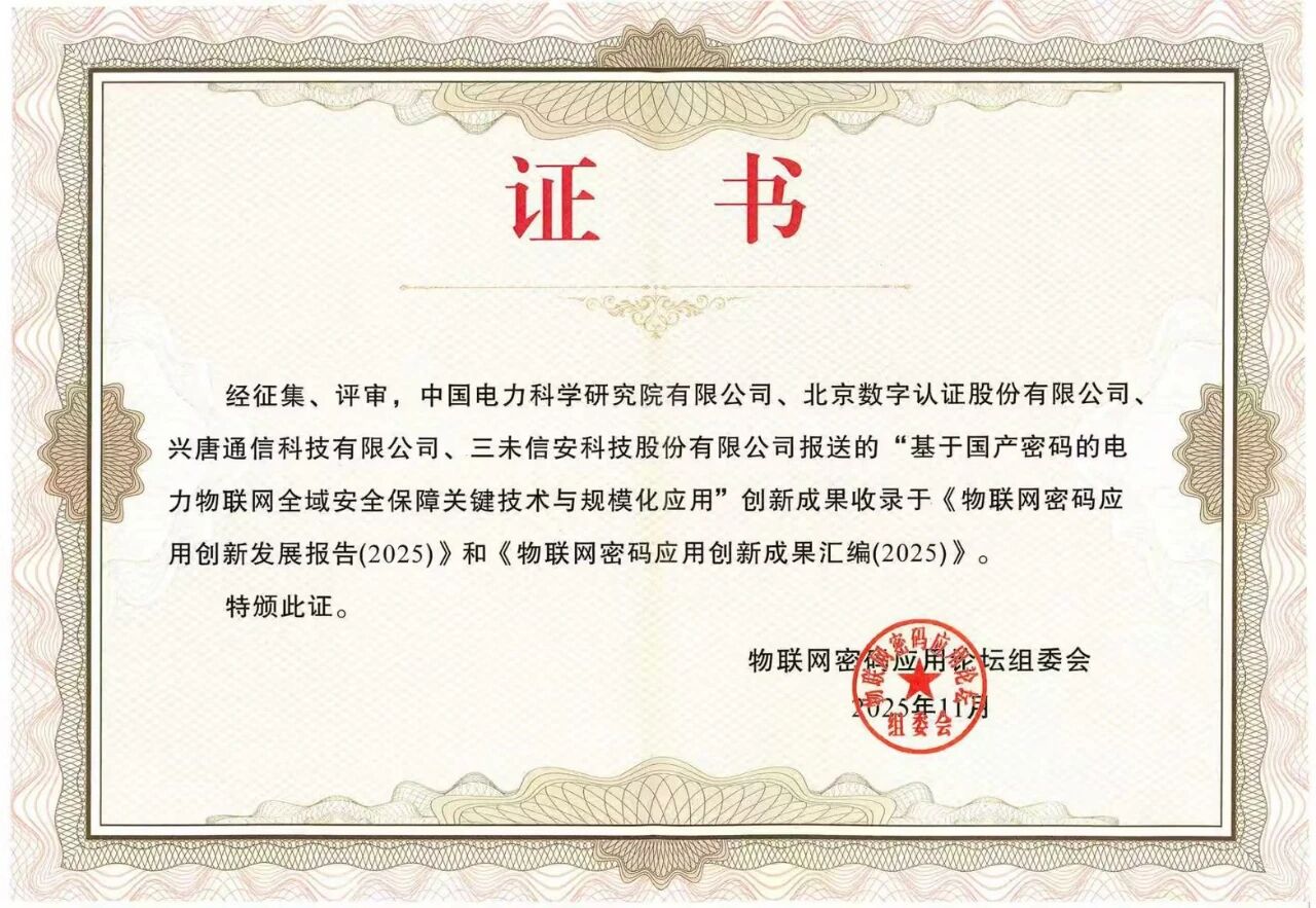 数字认证2项成果入选中国密码学会2025物联网密码应用创新成果名单