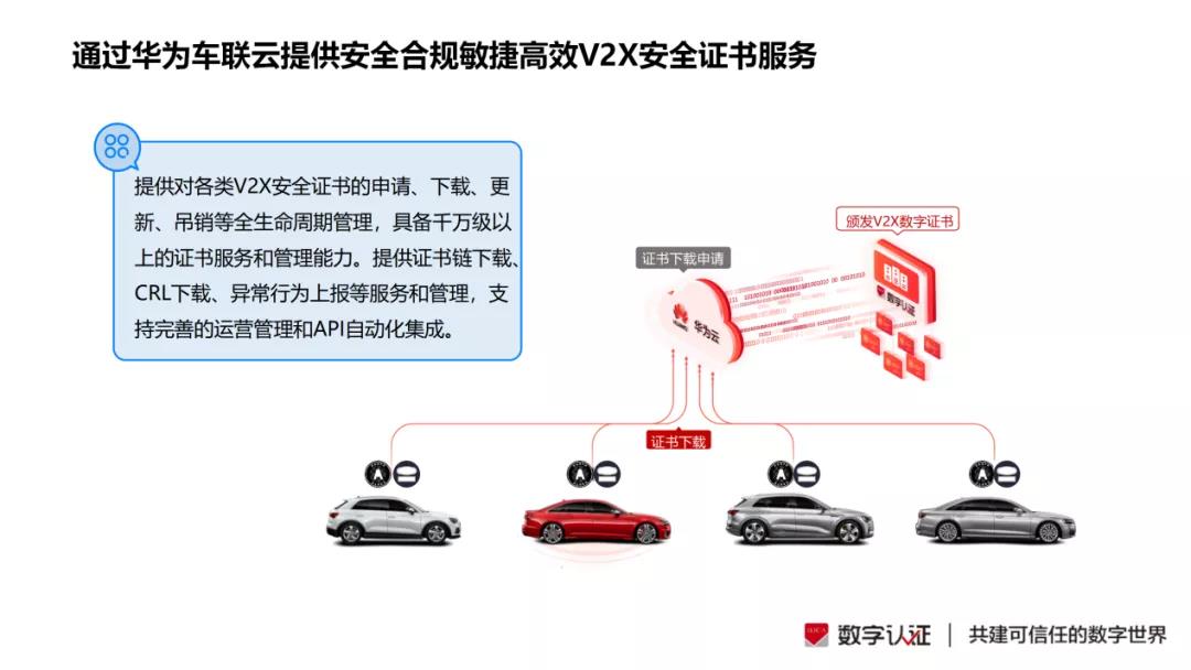 基于数字认证联合华为云共同构建的安全合规敏捷高效网络信任服务平台,数字认证与华为联合国际知名车企成功完成2019和2020 C-V2X“四跨” 应用示范测试。不仅如此,数字认证还与华为共同推广车联网V2X安全证书服务,一方面构建了业内首个大规模商用V2X证书服务平台,为多家国际知名车企提供服务,另一方面还在深圳坪山智能网联交通产业示范区提供V2X安全证书服务。