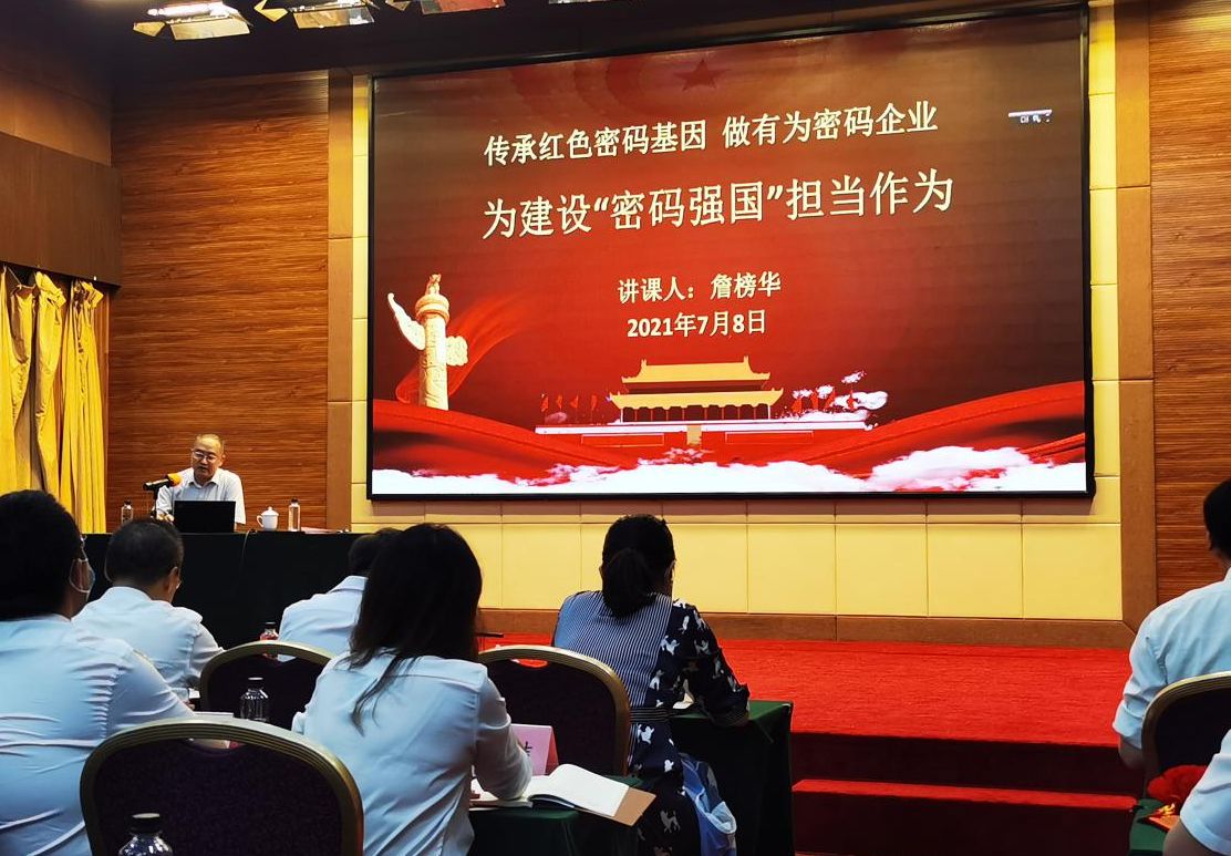 会上,詹榜华同志以《传承红色密码基因 做有为密码企业,为建设“密码强国”担当作为》为题讲授专题党课。詹榜华同志带领全体党员学习了习近平总书记在庆祝中国共产党成立100周年大会上的重要讲话精神,回顾了党的密码工作在我国新民主主义革命、社会主义建设、改革开放时期发挥的不可替代的、特殊的重要作用和党的隐蔽战线上革命先烈的英雄事迹。