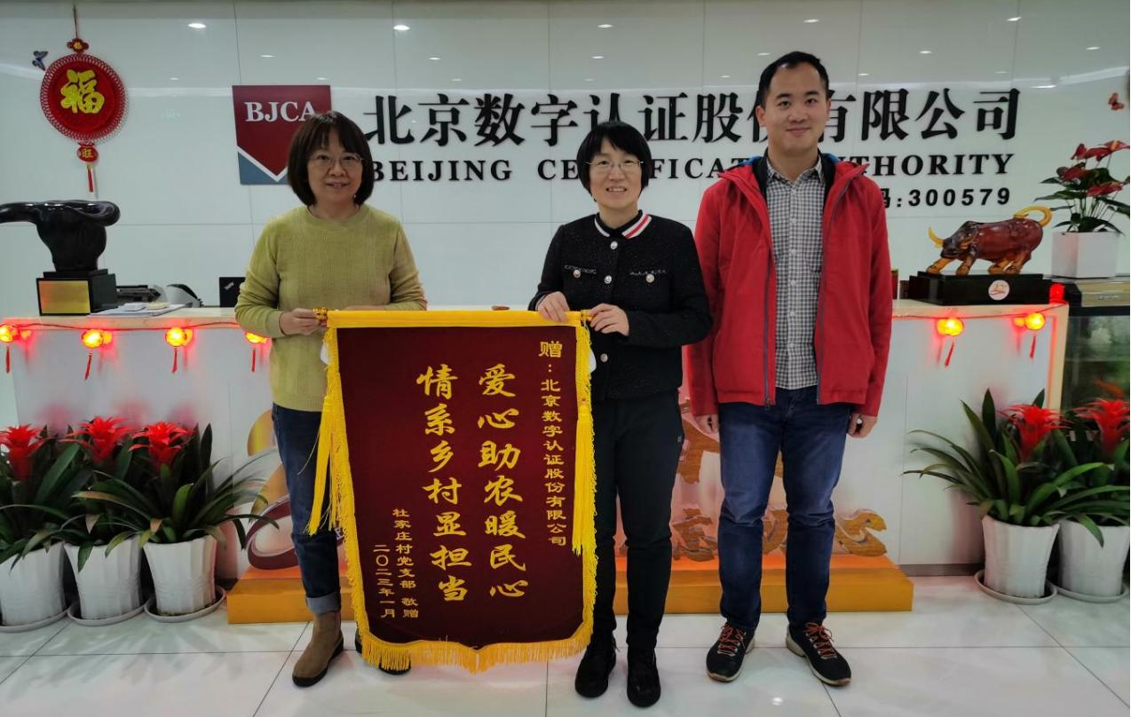 在慰问期间,“第一书记”受门头沟区杜家庄村委会委托,向数字认证公司赠送感谢锦旗。2022年数字认证公司党委高度重视对杜家庄村的帮扶工作,公司主要领导、工会主席及相关部门多次前往杜家庄村对接调研帮扶工作,组建成立了帮扶杜家庄村的志愿服务队,帮助杜家庄村建设官方微信公众号,开展采收村内农产品等特色志愿帮扶活动,积极采购13万元助农产品,从产业帮扶、消费帮扶、党建帮扶等方面,用实际行动助力杜家庄村建设和经济发展。此次收获的锦旗也承载着杜家庄村对数字认证公司党委开展的系列帮扶活动、帮助杜家庄村实现村集体收入持续增长的充分认可和感谢。